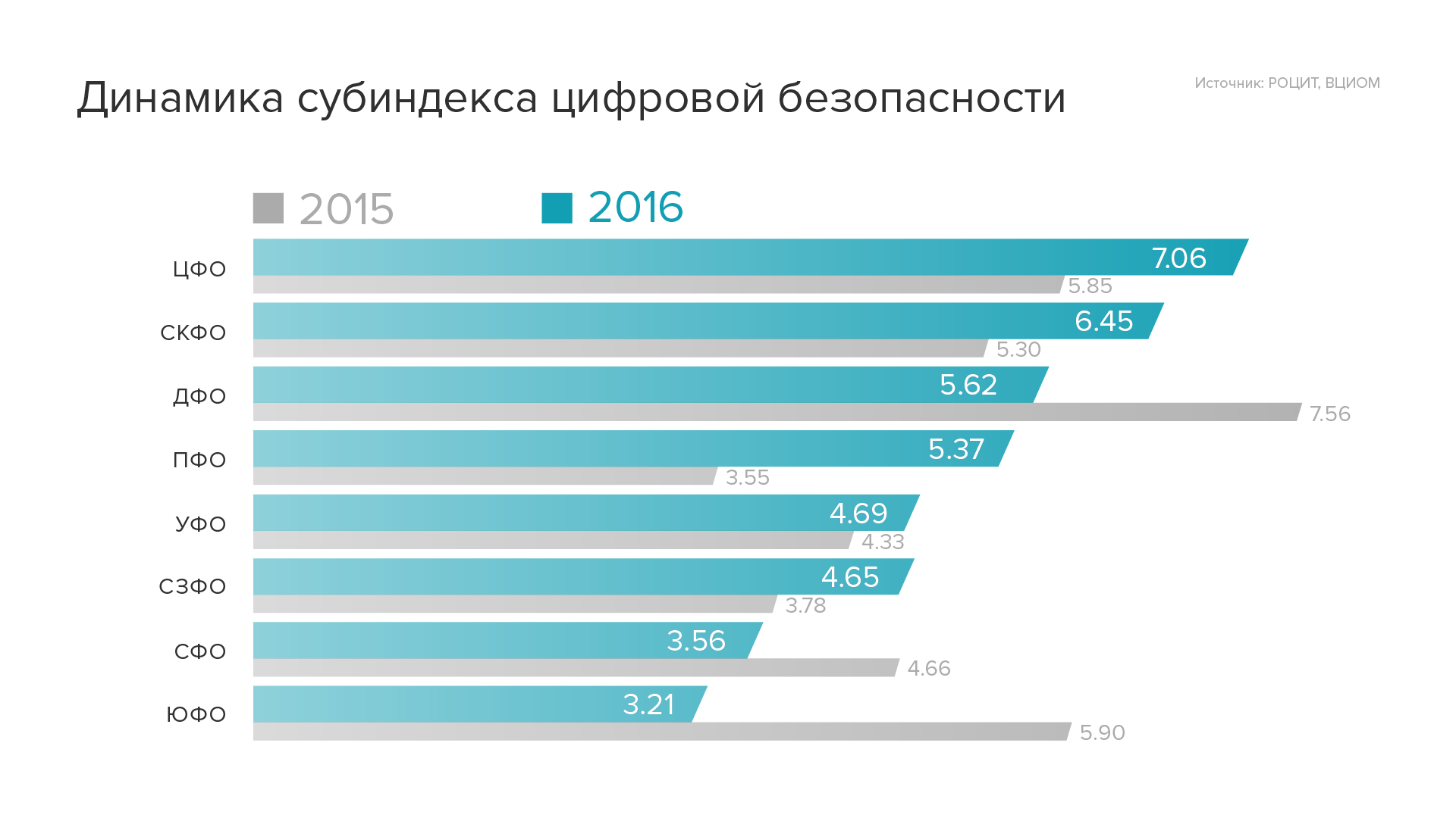 На первое место по усредненному значению по России вышел субиндекс цифровой безопасности, составивший 5,57 (против 4,86 в 2015 г.). Для многих округов, этот показатель был болевой точкой, в частности, для лидера — Северо-Западного округа. Данные второй волны демонстрируют его активный рост, также в Северо-Кавказском, Центральном, Приволжском и Уральском округах. Сравнительно менее значимое развитие показали Сибирский и Южный округа. Зонами роста данного субиндекса стали уровень культуры поведения в социальных сетях, наращивание данного показателя было значительным и равномерным.