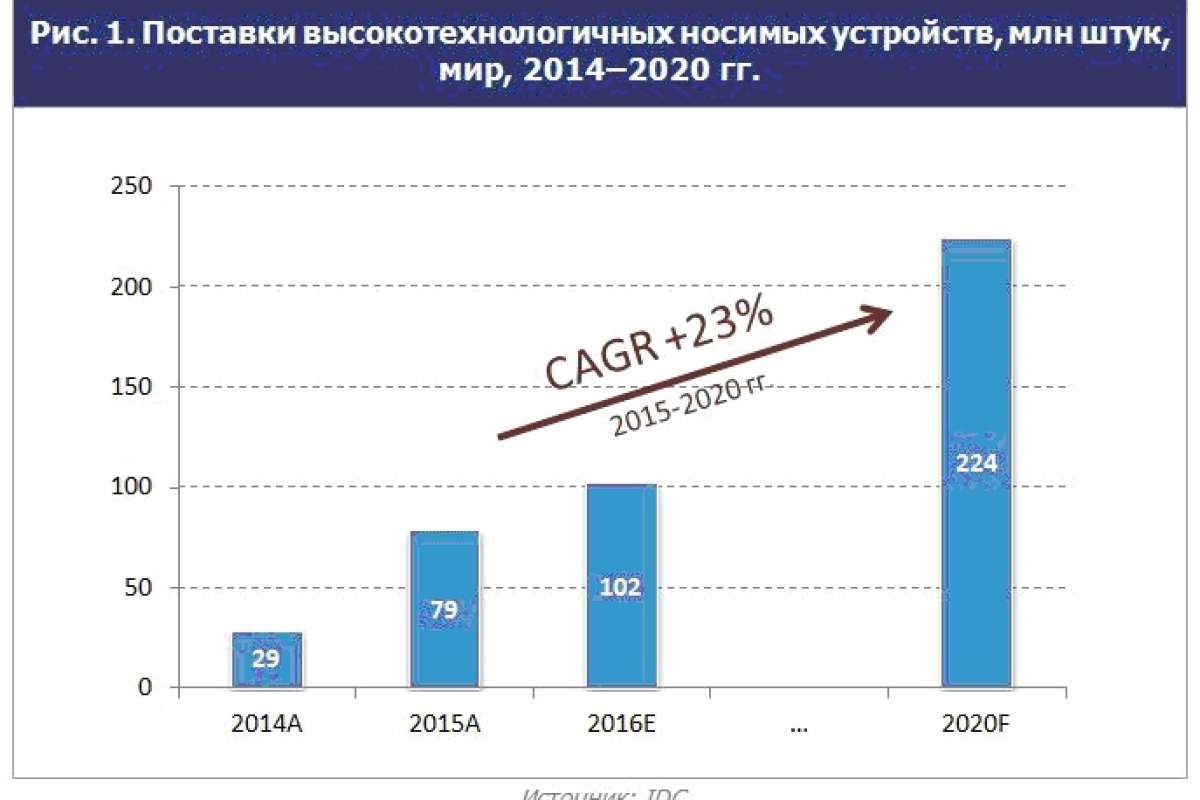 По оценкам IDC, мировые поставки высокотехнологичных носимых устройств, по итогам 2016 года, вырастут на 30 % по сравнению с результатами 2015 года и превысят 100 млн устройств. По сравнению с итогами 2014 года рынок вырастет в 3,5 раза. К 2020 году рынок увеличится до 224 млн устройств со среднегодовыми темпами роста около 23 %.