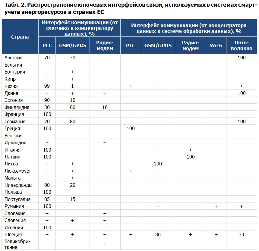 В странах ЕС наибольшее распространение получили интерфейсы передачи данных при помощи GSM/GPRS каналов, PLC- и радиоканалов. Ниже приведены ключевые интерфейсы связи, используемые в системах смарт-учета энергоресурсов в странах ЕС.