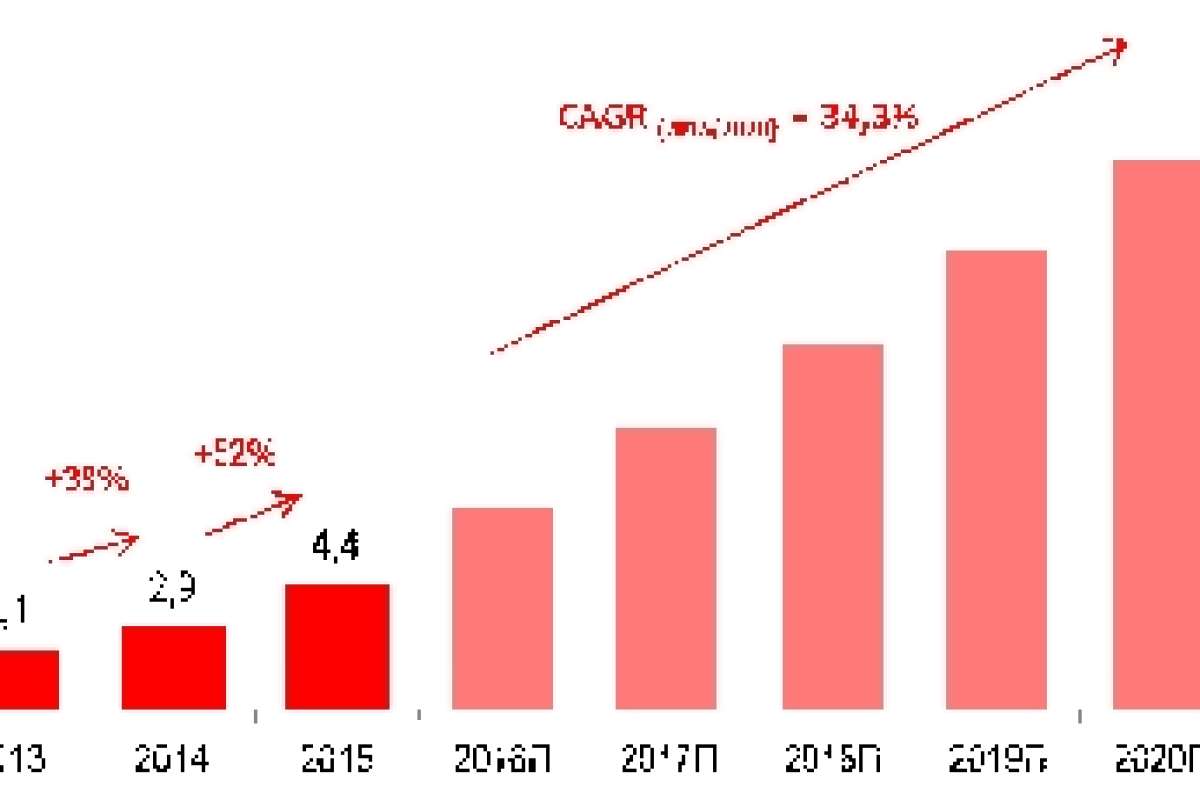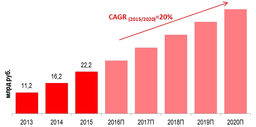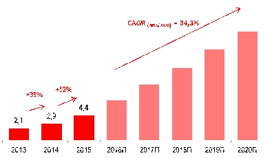 По оценкам iKS-Consulting, объем рынка в 2015 г. составил 27,6 млрд руб., показав рост на 39,6% к предыдущему году.
