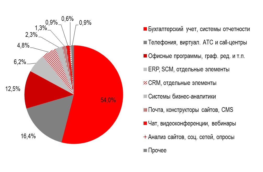 54% рынка составляет сегмент программного обеспечения для ведения бухгалтерского учета и подготовки и сдачи отчетности в налоговые органы. Вторым по объему является сегмент виртуальной телефонии, который занимает 16,4% рынка SaaS. Третьим сегментом рынка SaaS следует рынок офисных программ и графических редакторов, на долю которого приходится 12,5%. Четвертый крупный сегмент — ERP- и SCM-системы и отдельные элементы этих систем (6,2%). Прочие услуги занимают 10,9% всей выручки.