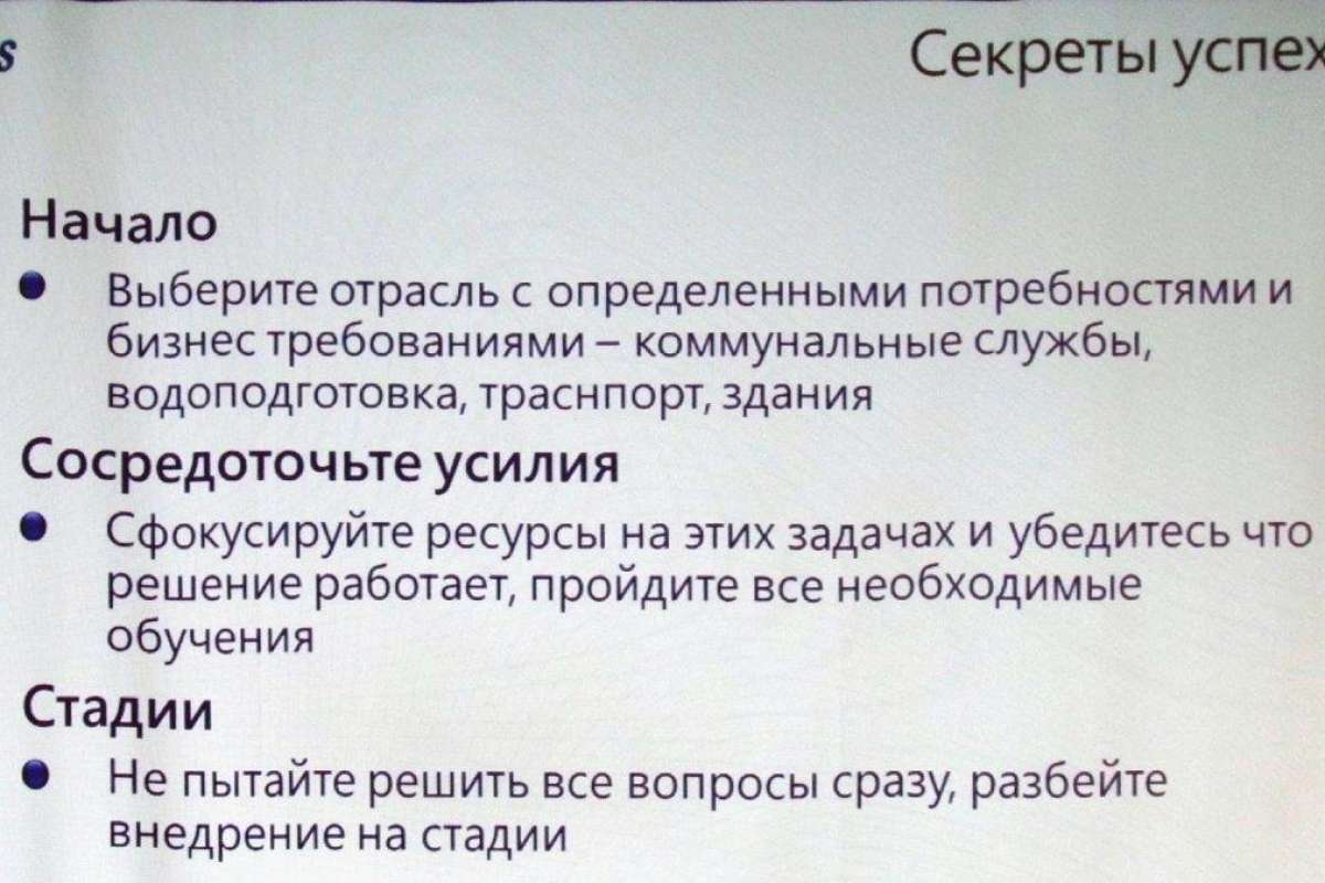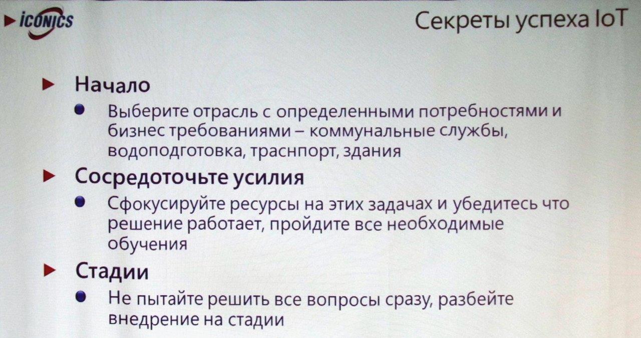 Однако ближе к делу. Во время недавнего (Москва, ноябрь 2016 г.) международного форума «Индустриальный интернет вещей» в рамках секции «Безопасное управление распределенными процессами на базе промышленного интернета вещей» исполнительный директор ICONICS Europe B.V. Зденек Задак (Zdenek Zadak) продемонстрировал замечательный слайд под названием «Секреты успеха IoT». Слайд этот содержал практические рекомендации интеграторам, присматривающимся к концепции IoT на предмет использования данной концепции в реализуемых ими проектах. Вот лишь две из них: «Выберите отрасль с определенными потребностями и бизнес-требованиями...»; «Не пытайтесь решить все вопросы сразу, разбейте внедрение на стадии».