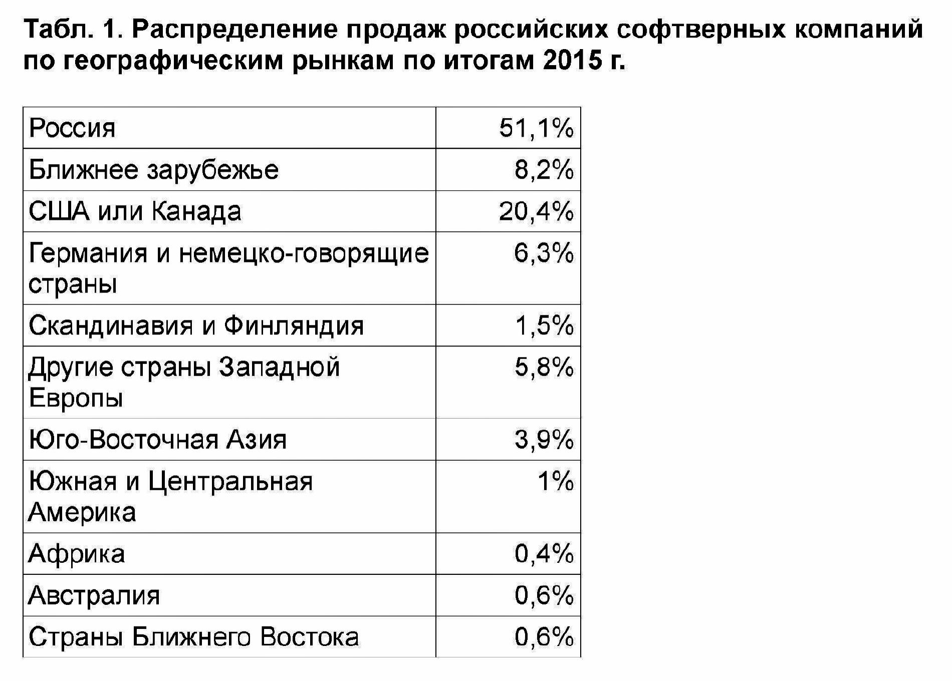 Впрочем, среди участников упомянутой выше «Встречи лидеров ИТ-рынка» были и такие, которые отмечали значительное количество переходов на их сайт с сайта Реестра отечественного ПО. Однако перейдем от частного к общему. Представляет интерес табл. 1 «Распределение продаж российских софтверных компаний по географическим рынкам по итогам 2015 г.». Из неё следует, что 51,1% этих продаж приходится на нашу страну. Далее следуют «США или Канада» (20,4%). А затем, с большим отрывом, «Германия и немецко-говорящие страны» (6,3%), «Другие страны Западной Европы» (5,8%) и Юго-Восточная Азия (3,9%).
