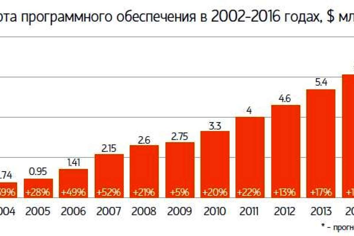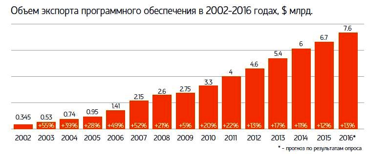 У многих возник вопрос: откуда взялась такая (7 млрд. долл.) цифра? Некоторые СМИ предположили, что она вытекает из оценок некоммерческого партнерства РУССОФТ*. Однако легко заметить (см. диаграмму, заимствованную из новейшего ежегодного исследования этого некоммерческого партнерства), что НП РУССФОТ оценивает «экспортнософтверные» итоги 2015 г. в 6,7 млрд. долл. Чем же обусловлено расхождение?