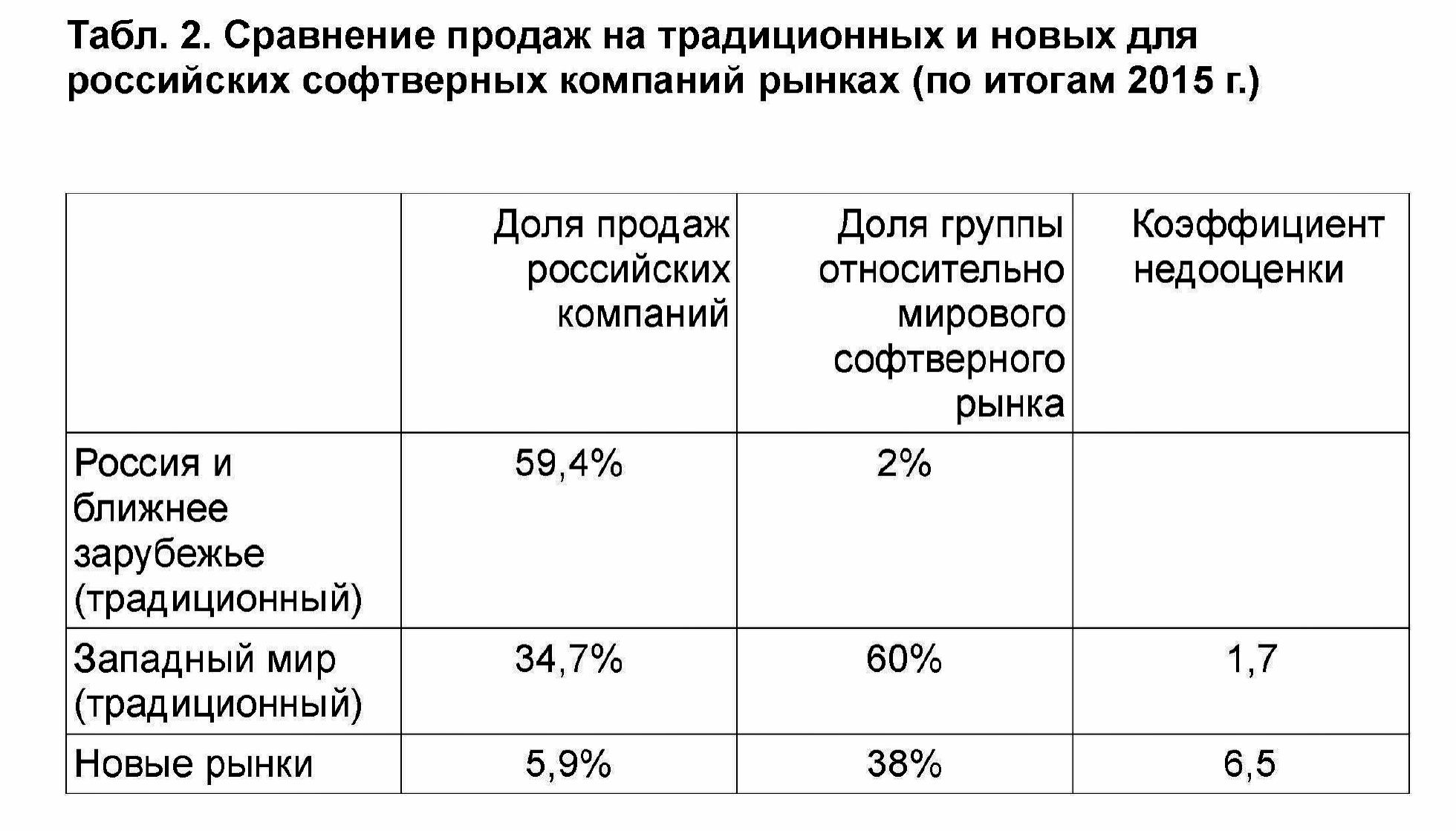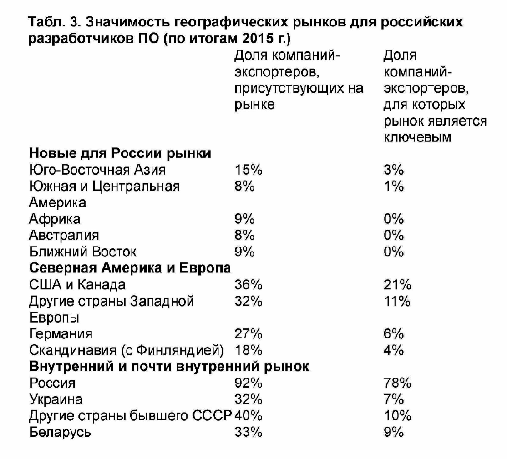 Также представляет интерес табл. 2 «Сравнение продаж на традиционных и новых для российских софтверных компаний рынках (по итогам 2015 г.)». Из неё следует, что на регион под названием «Россия и ближнее зарубежье» приходится 59,4% продаж российских компаний, на регион «Западный мир (традиционный)» 34,7% продаж, а на «Новые рынки» 5,9%. Более подробные сведения о том, какие рынки являются для отечественных компаний новыми, а какие традиционными, можно найти в табл. 3 «Значимость географических рынков для российских разработчиков ПО (по итогам 2015 г.)».