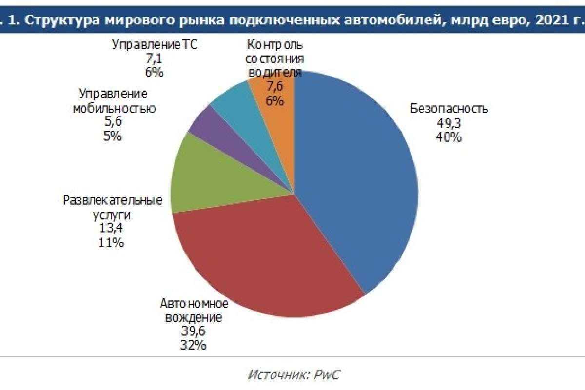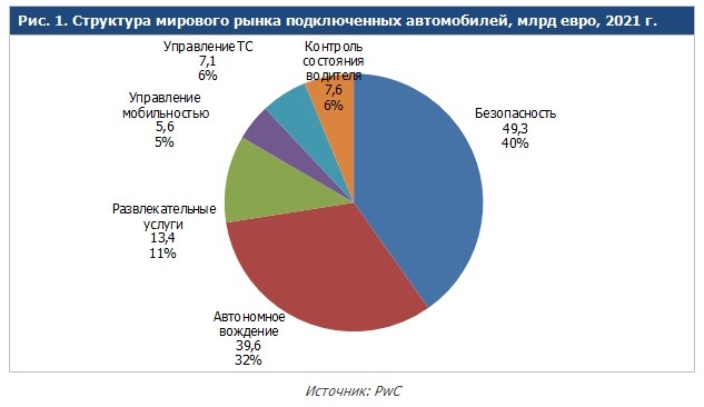 По прогнозам PwC, объем мирового рынка подключенных автомобилей в денежном выражении в ближайшие 5 лет вырастет более чем в три раза и к 2021 г. превысит 122 млрд евро (рис. 1). Крупнейшими сегментами рынка останутся системы обеспечения безопасности, автономного вождения и информационно-развлекательных услуг. На их долю в совокупности придется 83 % в 2021 г.