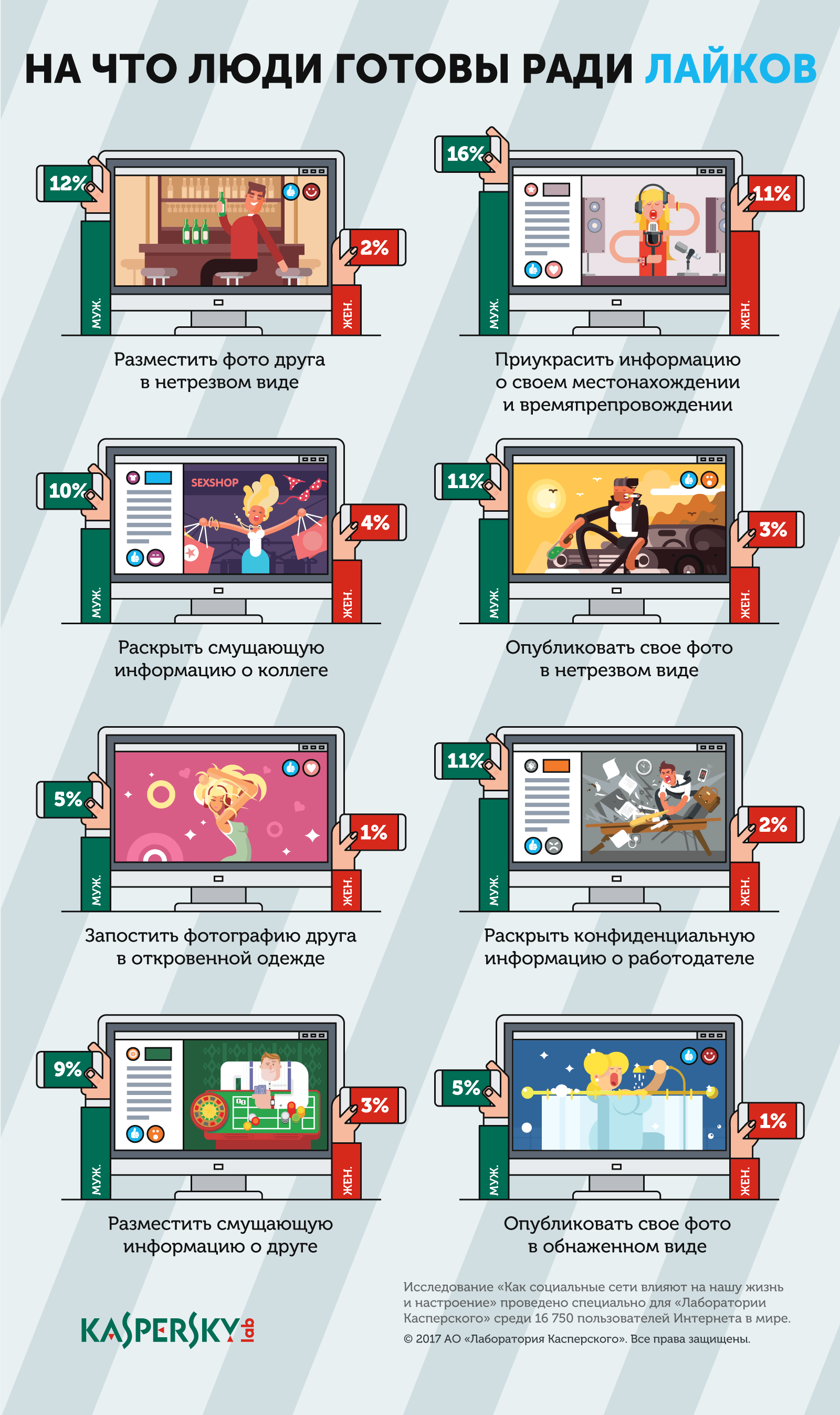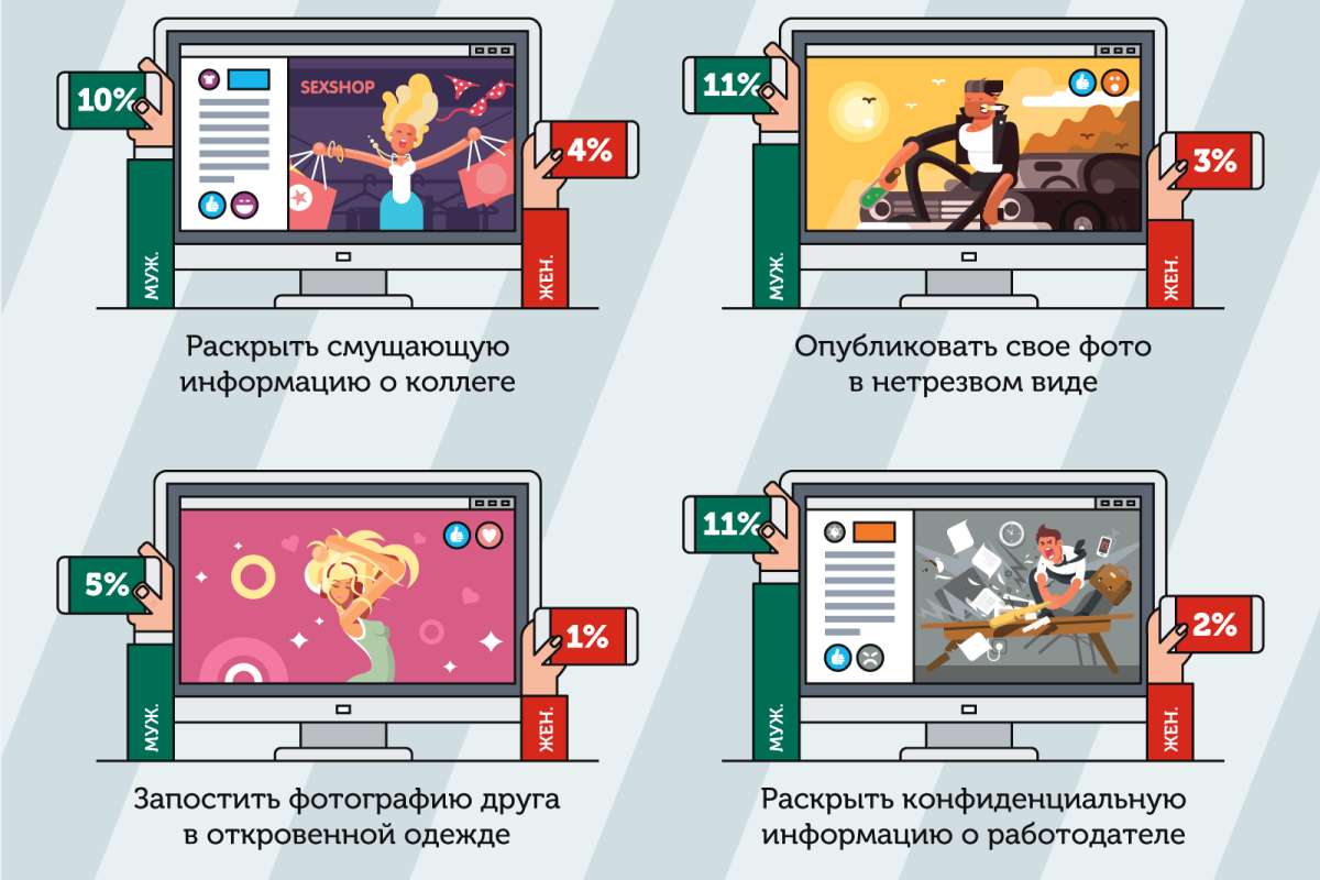 Но в погоне за лайками пользователи готовы нарушать не только правила информационной безопасности, но и этические нормы, публикуя информацию, в которой компрометируют друзей. Более 5% российских мужчин признались, что могут постить фотографии близких в откровенной одежде (для женщин этот показатель немногим выше 1%). Мужчины чаще, чем женщины, готовы раскрывать секретную или смущающую информацию о своем окружении: в отношении друзей на такое могут пойти 9% опрошенных представителей сильного пола (среди женщин — 3%), в отношении коллег — 10% и 4% соответственно, работодателя — 11% и 2%. Кроме того, 12% российских мужчин признались, что не видят ничего страшного в том, чтобы публиковать фотографии друзей в нетрезвом виде. Среди женщин с ними согласились всего 2%.