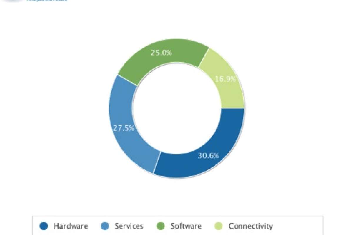 С точки зрения сегментов ИТ, оборудование будет оставаться крупнейшей категорией расходов на протяжении прогнозного периода; следом идут услуги, ПО и сети связи. И хотя расходы на оборудование почти удвоятся за пятилетний период, это будет самая медленно растущая группа в IoT. Расходы на ПО и на услуги будут расти быстрее, чем на оборудование и сети связи. К 2020 году расходы на оборудование приблизятся к 400 млрд. долл. Доминирующей категорией закупок будут сенсоры и модули, подключающие оконечные устройства к сети, а на долю прикладного ПО будет приходиться более половины всех инвестиций в программное обеспечение IoT.