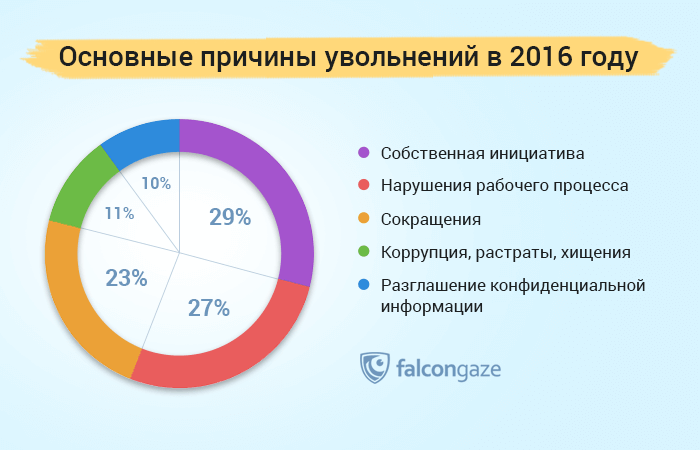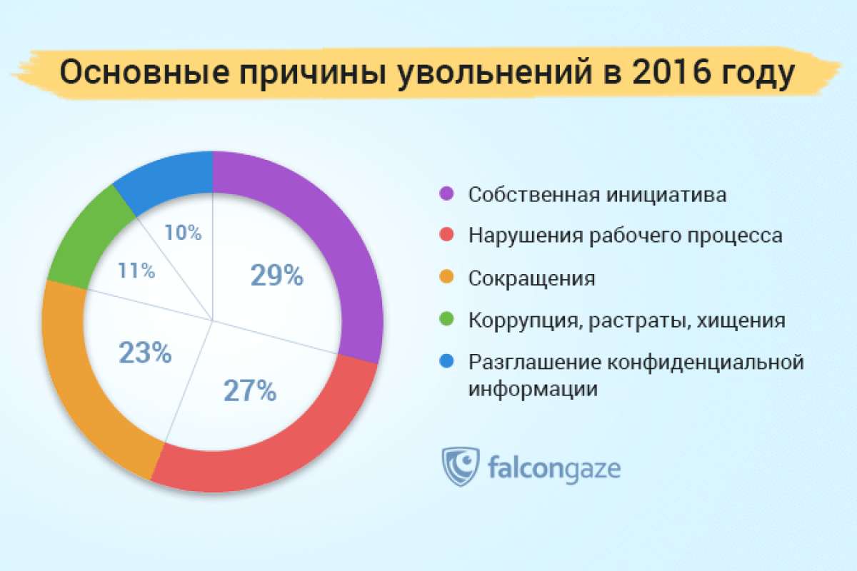 По итогам прошедшего года специалисты аналитического центра Falcongaze подготовили список наиболее распространенных причин увольнений (как по своему желанию, так и по воле работодателей) сотрудников в российских компаниях. Данные для исследования были получены от клиентов в самых разных сферах экономики, от нефтегазового и банковского сектора до логистики и туризма, использующих в своей работе программный комплекс SecureTower, предназначенный для борьбы с утечками данных, оптимизации рабочих процессов и мониторинга рабочего времени.
