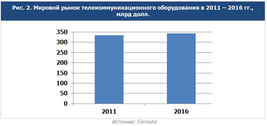 Согласно оценкам международной компании Forrester, объем глобального рынка телекоммуникационного оборудования достиг почти 350 млрд долл. Следует отметить, что основными потребителями телекоммуникационного оборудования являются как сами операторы связи, так и корпоративные клиенты (предприятия).