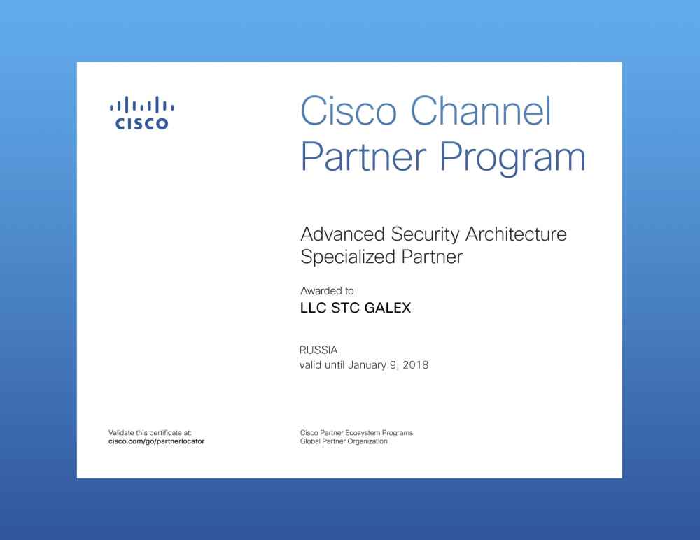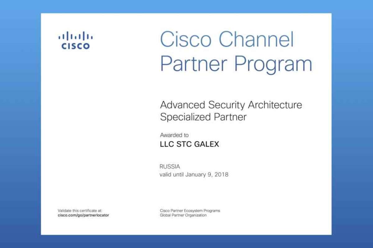 «НТЦ Галэкс» получил новую специализацию Cisco — Advanced Security Architecture. Данная специализация является гарантией высокого качества услуг, предоставляемых компанией в области обеспечения информационной безопасности на базе технологий Cisco.