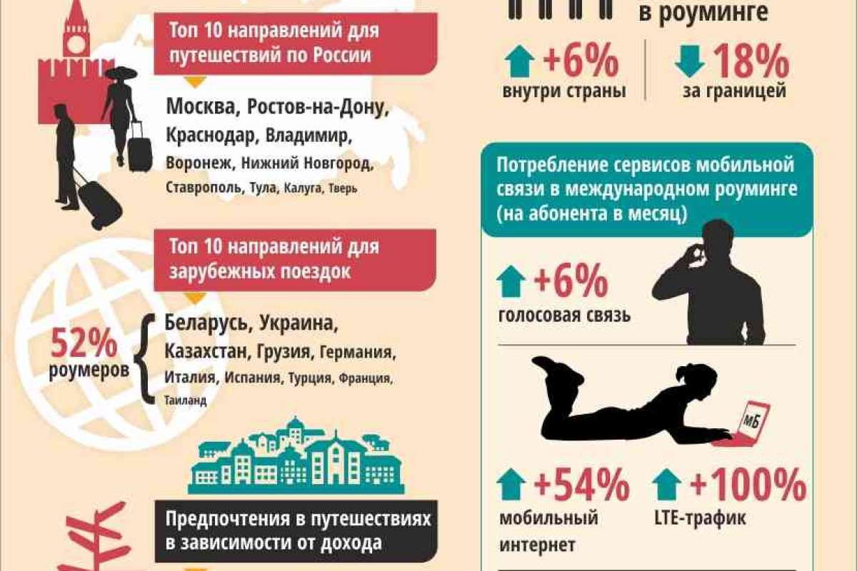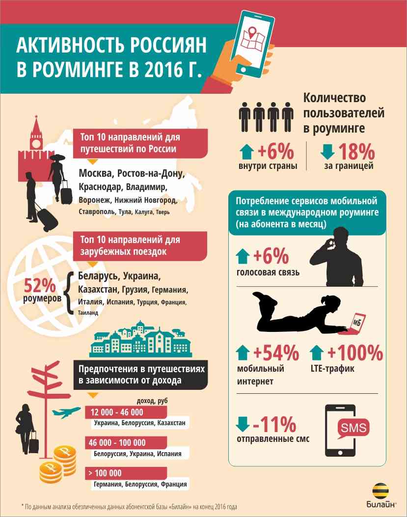 Несмотря на меняющуюся экономическую ситуацию и снижение покупательской способности, россияне в 2016 году продолжили путешествовать не только в страны СНГ, но в Европу и Азию. В 2016 году наиболее популярными направлениями в международном роуминге стали (в порядке убывания) Белоруссия, Украина, Казахстан, Грузия, Германия, Италия, Испания, Турция, Франция и Таиланд, на которые пришлось порядка 52% роумеров. В 2015 году топ-10 выглядел так: Белоруссия, Турция, Украина, Казахстан, Египет, Грузия, Германия, Италия, Испания, Узбекистан — 56% роумеров.