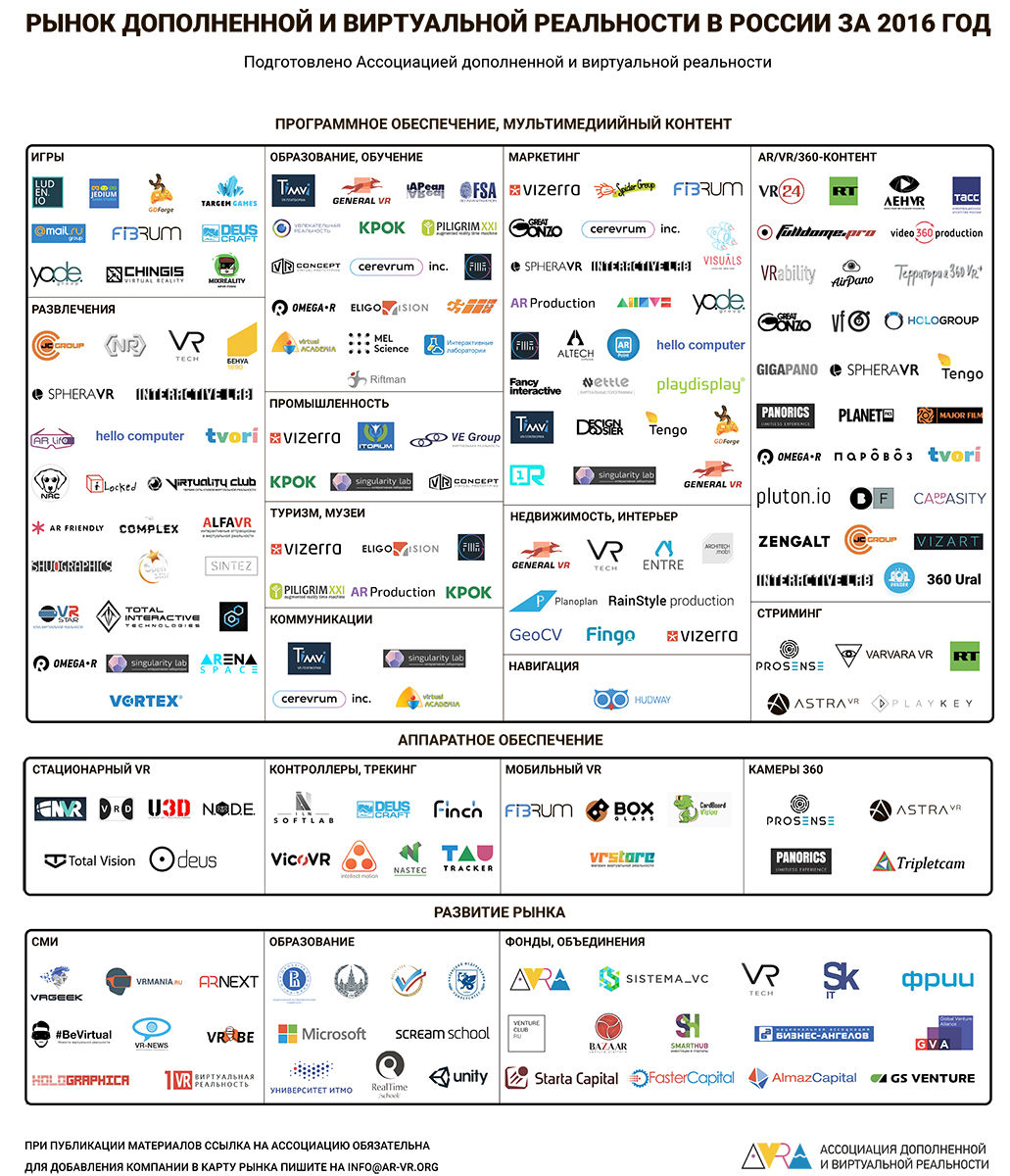 Ассоциация дополненной и виртуальной реальности (AVRA), в которую входят ключевые эксперты отрасли, проанализировала рынок АR/VR технологий в России и выявила, что за 2016 год количество активно развивающихся компаний в стране выросло в 3 раза: с 60 до 183. По месту расположения и активности 105 компаний находятся в Москве, 25 в Санкт-Петербурге, остальные расположены в городах по всей стране.
