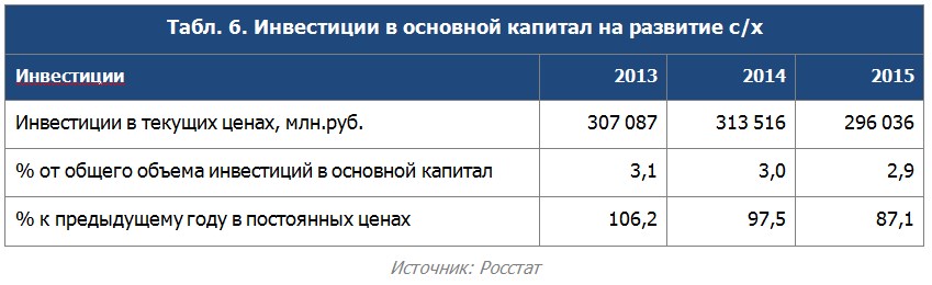 2010-2015 гг. Основными драйверами роста являлись государственные субсидии, низкие процентные ставки и процессы консолидации отрасли, в ходе которых сформировались крупные вертикально интегрированные холдинги. Их развитие повышало спрос на крупную мощную технику, необходимую для обработки больших территорий. Сейчас эта динамика исчерпана и в связи с низкими мировыми ценами на продовольствие и укреплением доллара в ближайшие 5 лет прогнозируется стагнация.4. В России количество с/х техники за 2005 — 2015 гг. упало в среднем более чем на 50%. Это касается практически всех видов техники: тракторы −51%, плуги −57%, культиваторы −47%. Несмотря на наличие механизмов государственной поддержки АПК, финансирование отрасли является недостаточным. В 2015 г. инвестиции в основной капитал сократились на 12,9%. В то же время практически в 3 раза был увеличен объем средств на покупку сельхозтехники по льготным ценам (до 5,2 млрд руб.) число приобретенной техники было увеличено в 1,4 раза. Однако данные темпы пока недостаточны: выполнен план только по поставке зерноуборочных комбайнов, а по тракторам и кормоуборочным комбайнам план еще не достигнут. - В России количество с/х техники за 2005 — 2015 гг. упало в среднем более чем на 50%. Это касается практически всех видов техники: тракторы −51%, плуги −57%, культиваторы −47%. Несмотря на наличие механизмов государственной поддержки АПК, финансирование отрасли является недостаточным. В 2015 г. инвестиции в основной капитал сократились на 12,9%. В то же время практически в 3 раза был увеличен объем средств на покупку сельхозтехники по льготным ценам (до 5,2 млрд руб.) число приобретенной техники было увеличено в 1,4 раза. Однако данные темпы пока недостаточны: выполнен план только по поставке зерноуборочных комбайнов, а по тракторам и кормоуборочным комбайнам план еще не достигнут