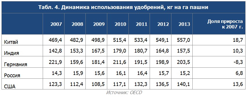 Под удобрениями в данной статистике понимаются фосфорные, калийные и азотистые вещества. В сельском хозяйстве рассматриваемых стран применяется все больше удобрений для повышения урожайности, наивысший показатель принадлежит Китаю, где за 7 лет использование удобрений увеличилось на 18,7% и в 2013 году составило 557 кг на гектар. Только в Германии наблюдается сокращение использования минеральных удобрений, за приведенный период этот показатель снизился на 8,3% и составил 203,5 кг на гектар. В России использование удобрений ниже рассматриваемых стран в десятки раз, также самая низкая динамика роста использования удобрений — 6,8%.