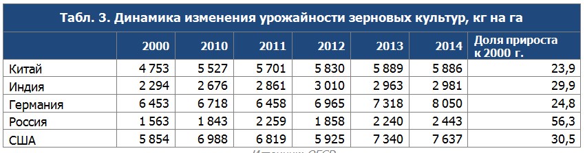 Наивысшую урожайность зерновых демонстрирует Германия, при этом динамика сокращения площадей пашни зерновых культур самая высокая. Также в России наблюдается расширение площади пашни под зерновые культуры, за 14 лет фактический показатель вырос на 1,1 млн га.
