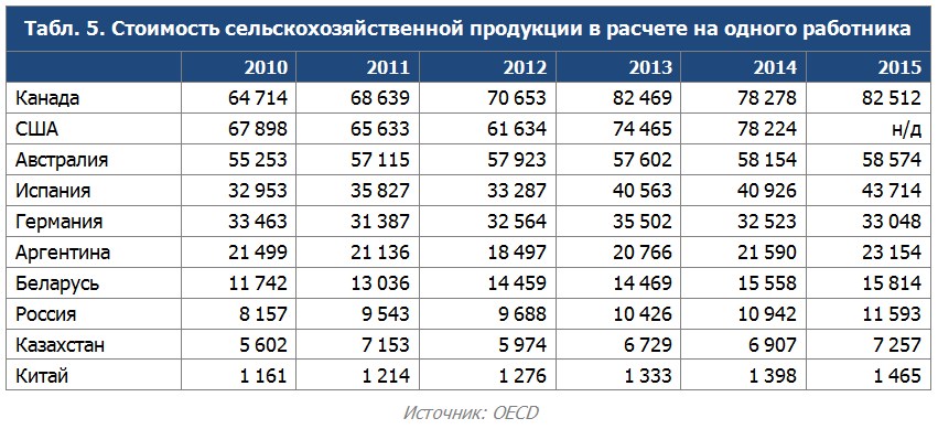 Наивысшие показатели стоимости сельскохозяйственной продукции на одного работника, по оценкам экспертов J`son & Partners Consulting, принадлежат Канаде, США и Австралии. По темпам роста за указанный период страны распределились следующим образом: Россия (+42%), Беларусь (+35%), Испания (+33%), Казахстан (+29%), Канада (+27%), Китай (+26%), США ( +15%).