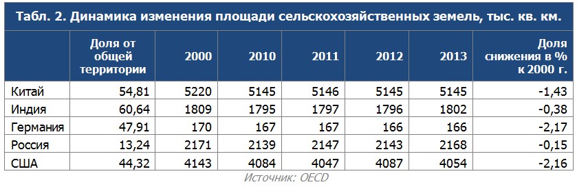По данным J`son & Partners Consulting, из рассматриваемых стран Россия имеет наименьшую долю сокращения сельскохозяйственных земель и третье по величине (после Китая и США соответственно) место по фактическому значению этого показателя.
