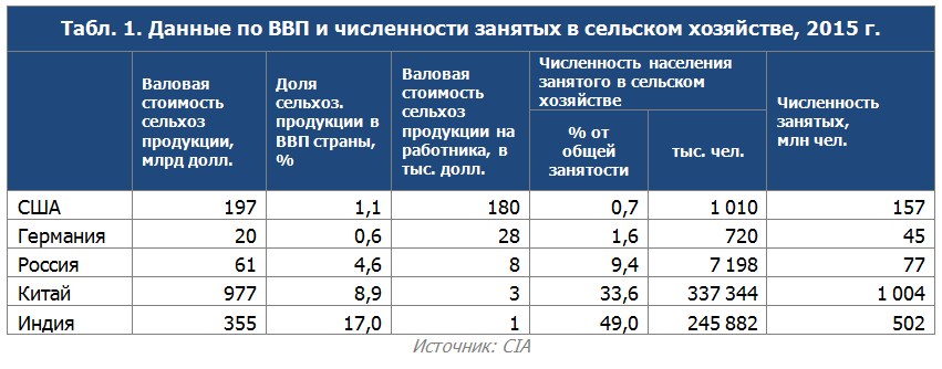 Как показал анализ J`son & Partners Consulting, в Индии и Китае наибольшая численность занятых в сельском хозяйстве и по абсолютной величине и по доле от общей занятости. Численность населения занятого в сельском хозяйстве Китая вдвое превышает общую численность населения России. В странах с развитой экономикой наблюдается снижение численности занятого в сельском хозяйстве населения и повышение стоимости сельскохозяйственной продукции в расчете на одного работника как показателя высокой эффективности в сельскохозяйственной отрасли. В России валовая стоимость сельхозпродукции на одного работника в 2015 г. составила 8 тыс. долл., что почти втрое превышает показатель Китая, но в десятки раз ниже, чем в США.