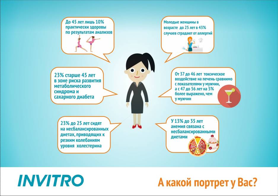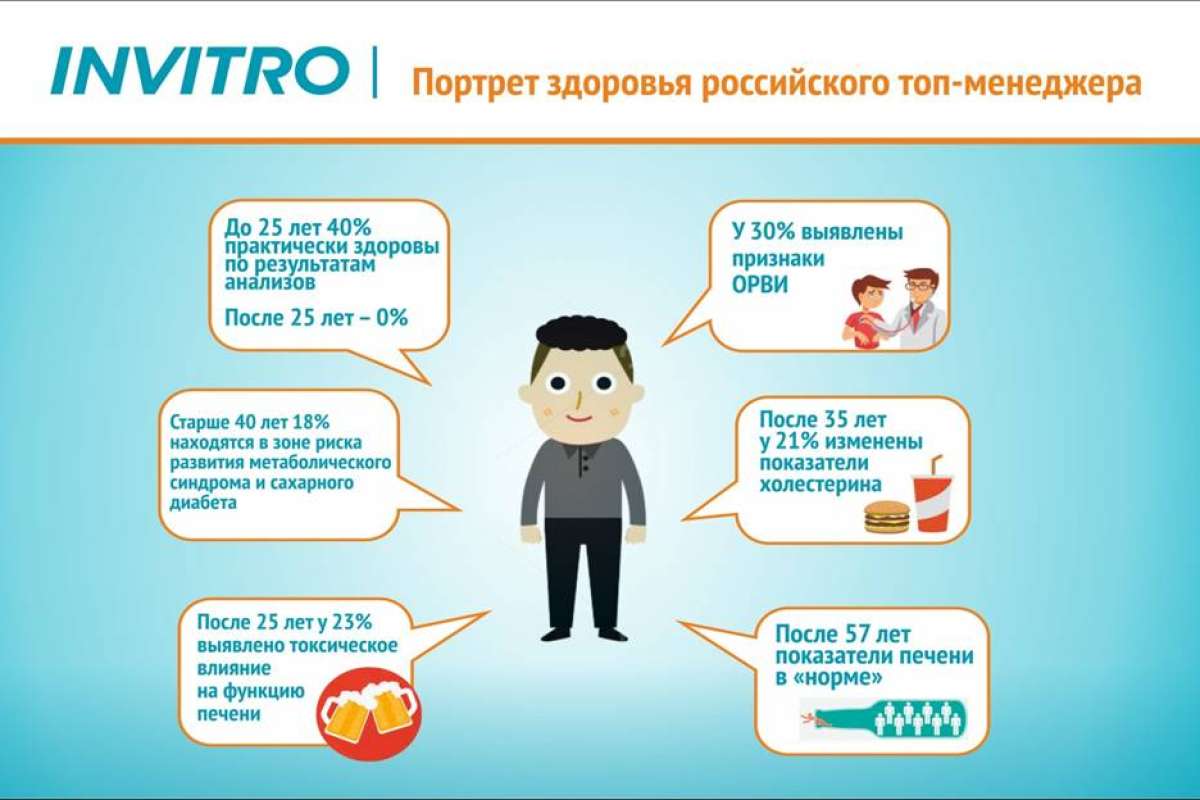 Специально для руководителей разного пола и возраста, принявших участие в исследовании, был разработан исследовательский профиль «Здоровье топ-менеджера». В комплексное лабораторное обследование вошли 12 анализов, необходимых для первичной оценки состояния организма и выявления возможных проблем. Новый профиль вскоре будет доступен всем пациентам и во всех медофисах ИНВИТРО.