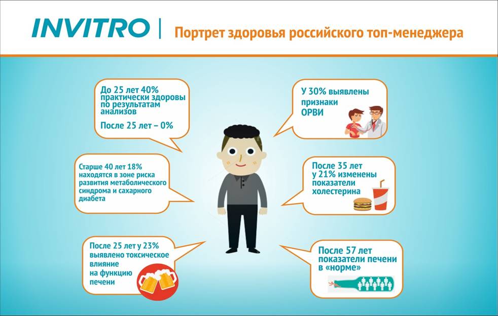 На презентации директор по корпоративным коммуникациям ИНВИТРО Антон Буланов рассказал об итогах исследования. В результатах исследований большинства пациентов были обнаружены отклонения некоторых лабораторных показателей от референсных значений. Так, среди мужчин топ-менеджеров старше 25 лет не нашлось ни одного полностью здорового человека. Среди явных угроз здоровью топ-менеджеров — проблемы с печенью, вызванные тем, что к 30 годам и мужчины, и женщины на руководящих постах начинают злоупотреблять алкоголем. Из-за того, что молодые женщины-управленцы мучают себя диетами, а мужчины топ-менеджеры питаются фаст-фудом, и те, и другие имеют повышенный уровень холестерина в крови. Больше 50% руководителей с возрастом попадают в группу риска по диабету II типа. При этом все топ-менеджеры слишком заняты, чтобы болеть дома, поэтому переносят заболевания на ногах.