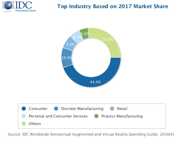 Потребительский рынок будет крупнейшим сегментом дополненной/виртуальной реальности на протяжении прогнозного периода, и мировые расходы на оснащение, ПО и услуги в 2017 году достигнут 6,2 млрд. долл., увеличившись на 130,5% по сравнению с прошлым годом, полагает IDC. Вторым по уровню расходов будет промышленный сектор, где приложения виртуальной и дополненной реальности постепенно находят себе повседневное применение. Ожидается, что дискретное (штучное) производство и ритейл будут единственными двумя сегментами, где расходы на AR/VR-решения в текущем году превысят 1,0 млрд. долл. К 2020 году ритейл, демонстрируя пятилетний темп роста (CAGR) 238,7%, опередит сегмент дискретного производства, став крупнейшим по расходам на AR/VR. Аналогичным образом, непрерывное производство выйдет на третье место в 2020 году, опередив сегмент индивидуальных и потребительских услуг (personal and consumer services). Самые высокие темпы роста после ритейла в течение прогнозного периода будут демонстрировать транспортные перевозки (CAGR 233,7%) и поставщики медицинских услуг (CAGR 231,8%).