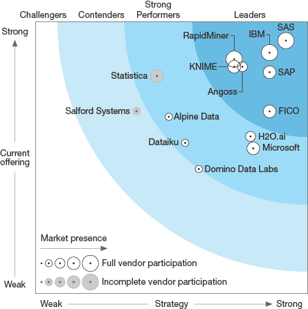 Компания SAS заняла лидирующую позицию в рейтинге The Forrester Wave™: Predictive Analytics and Machine Learning Solutions, Q1 2017. В ходе исследования эксперты оценивали решения 14 поставщиков по 23 критериям, которые были объединены в три основные группы: «текущие предложения», «стратегия» и «присутствие на рынке».