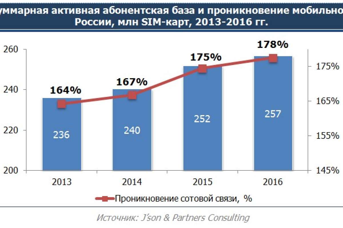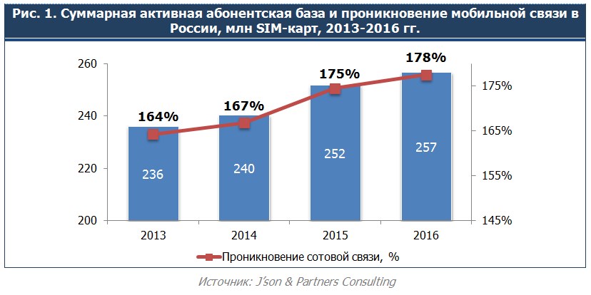По оценкам J’son & Partners Consulting, по состоянию на конец 2016 года проникновение сотовой связи в России составило около 178 %, что эквивалентно 257 млн абонентов. Таким образом, рост абонентской базы по сравнению с итогами 2015 года составил 2 %. Рынок показывает признаки насыщения. В основном рост абонентской базы сейчас обеспечивают абоненты мобильного Интернета (в том числе M2M-подключения).