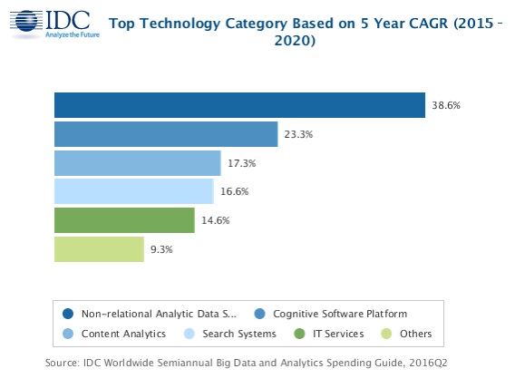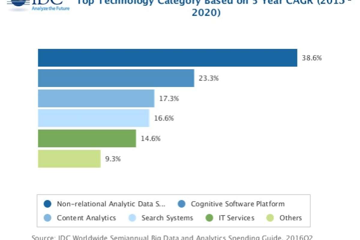 Лидером инвестиций в технологии BDA будут сегменты ИТ- и бизнес-услуг, которые вместе составят более половины всех расходов на средства обработки больших данных и бизнес-анализа в 2017 году и в течение прогнозного периода. Расходы на услуги продемонстрируют также самые высокие темпы роста, с пятилетним CAGR 14,4%. Инвестиции в ПО вырастут до более чем 70 млрд. долл. в 2020 году, основная их часть будет приходиться на обработку опросов конечных пользователей, инструменты отчетности и анализа и средства управления хранилищами данных. Самые высокие темпы роста будут демонстрировать нереляционные хранилища аналитических данных и когнитивные платформы ПО (CAGR 38,6% и 23,3% соответственно), поскольку организации будут расширять использование больших данных и аналитики. Закупки серверов и СХД, связанные с технологиями BDA, будут расти на 9,0% ежегодно (CAGR) и достигнут 29,6 млрд. долл. в 2020 году.