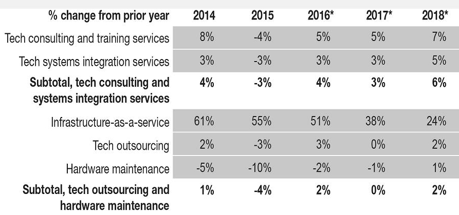 Теперь вернемся к отечественному рынку ИТ-сервисов (IT Services). Аналитики НП «АСТРА» полагают, что по итогам 2016 г. российский рынок ИТ-аутсорсинга (ITO) составил примерно треть российского рынка ИТ-сервисов. Они также полагают, что в ближайшие три года среднегодовые темпы прироста российского рынка ITO составят 18%, в то время как среднегодовые темпы прироста российского рынка ИТ-сервисов составят лишь 4,7%. Приводят они и денежные оценки данных рынков: 4,5 млрд. долл. США (российский рынок ИТ-сервисов по итогам 2015 г.) и 1,8 млрд. долл. (российский рынок ITO по итогам 2016 г.).