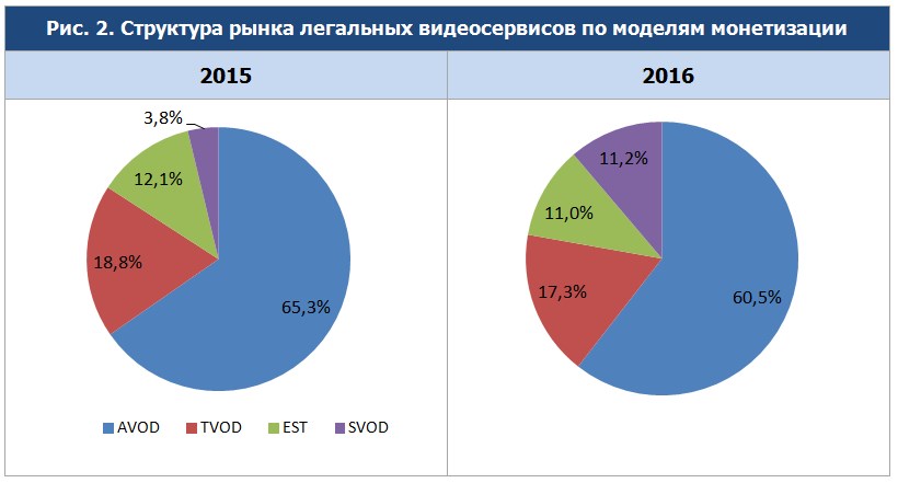В 2016 году в структуре рынка произошли существенные изменения. Как и прежде, наиболее распространенной моделью монетизации является AVOD. Но игроки все более успешно зарабатывают на платном контенте, прилагая к этому много усилий (развитие платформ доставки, реклама, улучшение сервиса и удобства оплаты). В результате в 2016 году доля AVOD на рынке значительно снизилась и составила 60,5 %. Главным бенифициаром стала подписка, доля которой увеличилась с 3,8 % до 11,2 %. Теперь она занимает третье место в структуре рынка и опережает сегмент EST.
