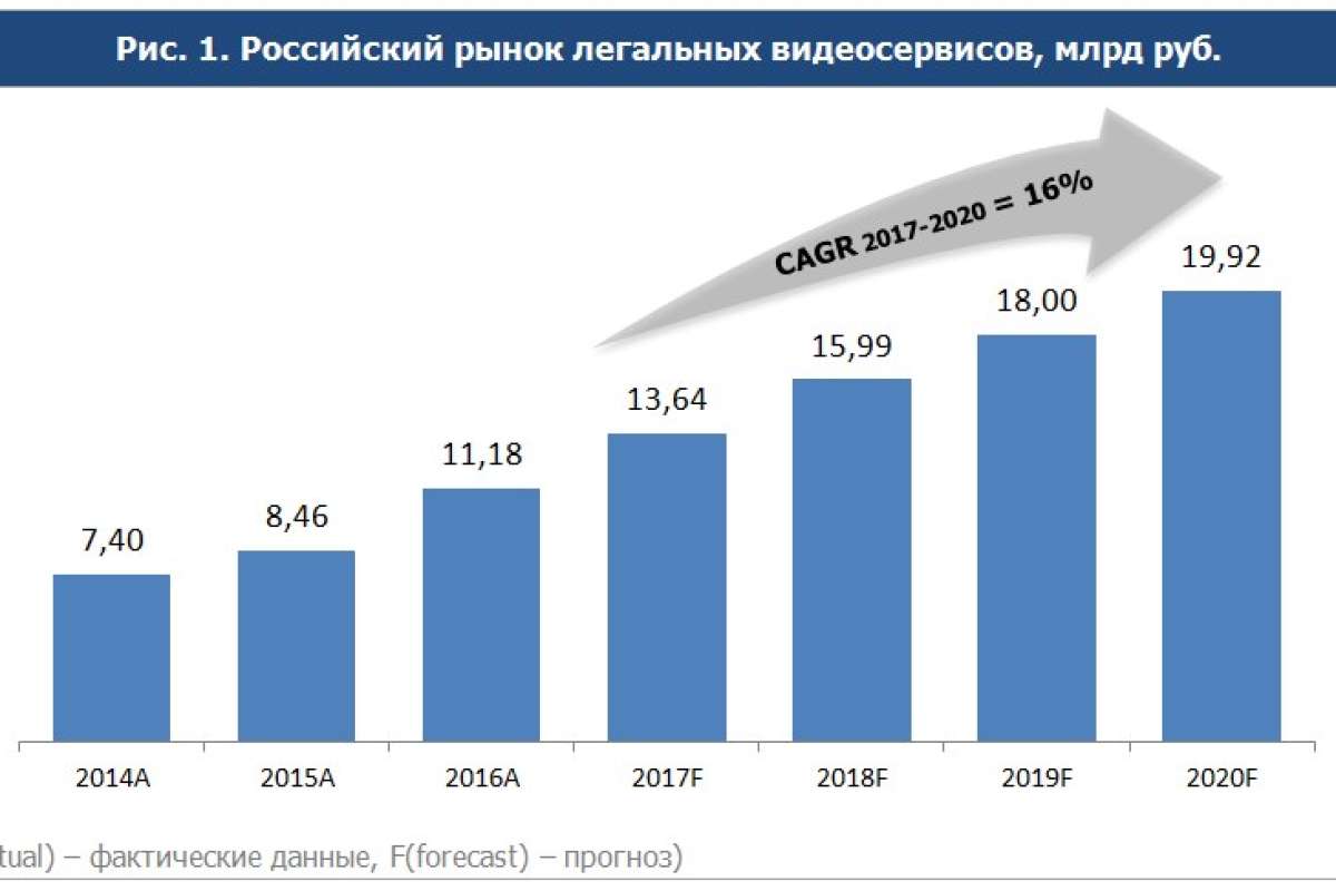 Согласно оценкам J’son & Partners Consulting, к 2020 году доходы рынка легальных видеосервисов вырастут на 78 % по сравнению с 2016 годом — почти до 20 млрд руб. Среднегодовой темп прироста в