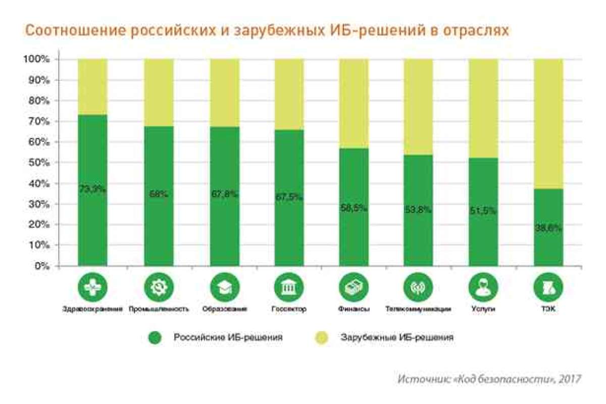 На текущий момент лидирующие позиции по закупкам только российских ИБ-решений занимают телекоммуникационная отрасль (46%), образование (42%) и госсектор (39%).