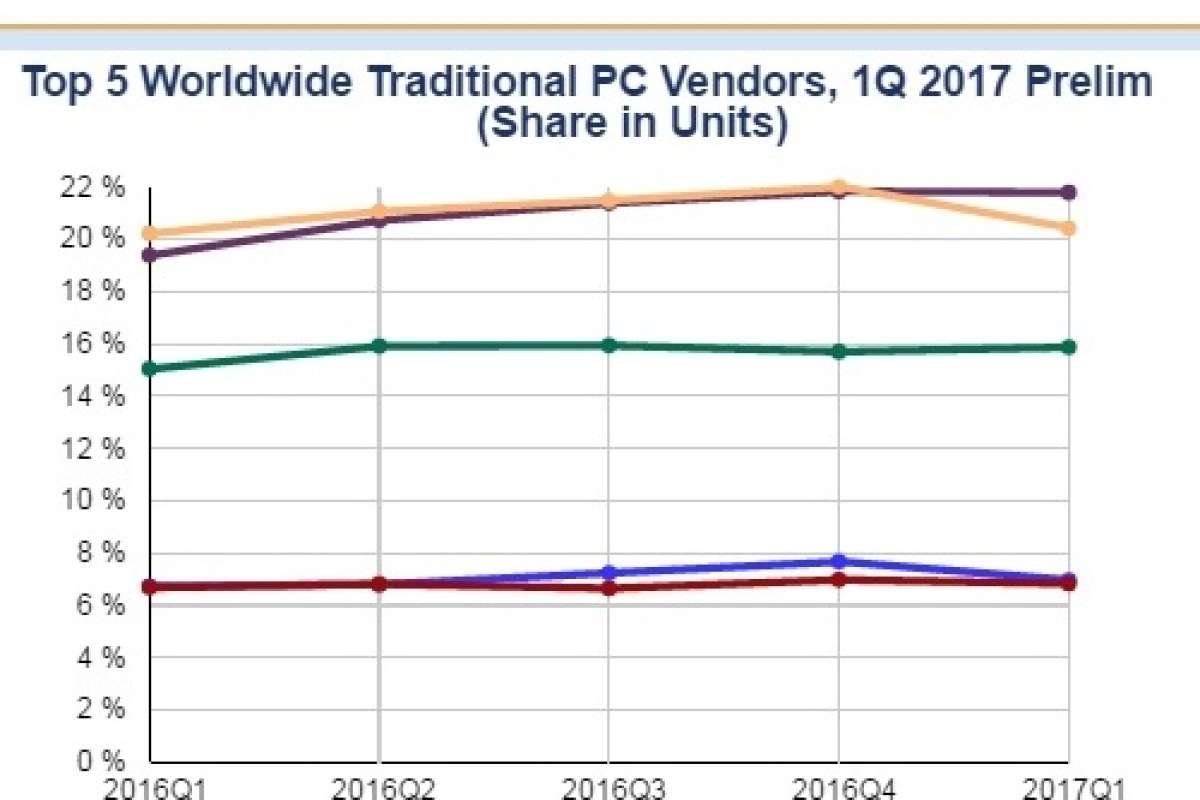 Acer вновь вернула себе пятое место, показав рост на 2,9%, отчасти благодаря выгодной базе сравнения с трудным 1 кварталом 2016 года.