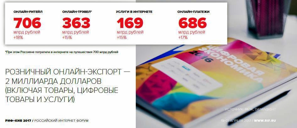 Такая оценка была озвучена во время доклада «Цифровая экономика России. Аналитика. Цифры. Факты», с которым директор РАЭК Сергей Плуготаренко 19 апреля выступил перед участниками российского интернет-форума «РИФ+КИБ 2017».