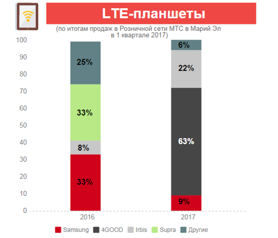 Если в прошлом году лидерство среди популярных LTE-планшетов удерживали устройства марки Samsung, то в первом квартале 2017 года жители Марий Эл проявили патриотизм и отдали предпочтение бюджетным планшетам отечественных производителей 4GOOD и Irbis.