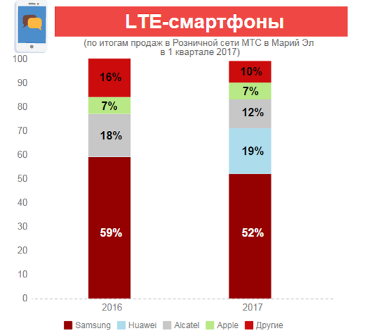 В итоге, места в ТОП-3 в рознице МТС в Марий Эл по итогам продаж с января по март 2017 года распределились следующим образом: «золото» — Samsung (52 процента), «серебро» — Huawei (19 процентов), «бронза» — Alcatel (12 процентов).