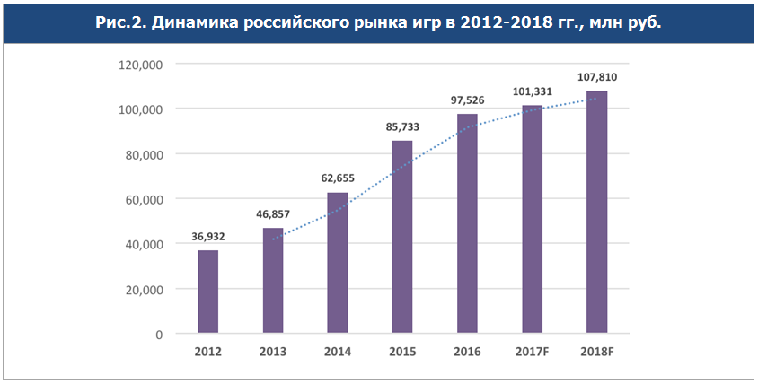 Согласно оценкам J’son & Partners, в 2016 году объем российского рынка игр составил 97,5 млрд руб., показав среднегодовой рост в период