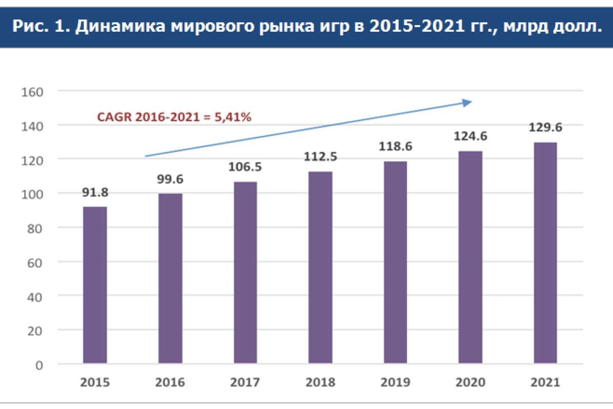 объем рынка в 2016 г. увеличился на 8,5% и достиг 99,6 млрд долл. Прогноз объема мирового рынка игр составит 130 млрд долл. к 2021 г. (CAGR