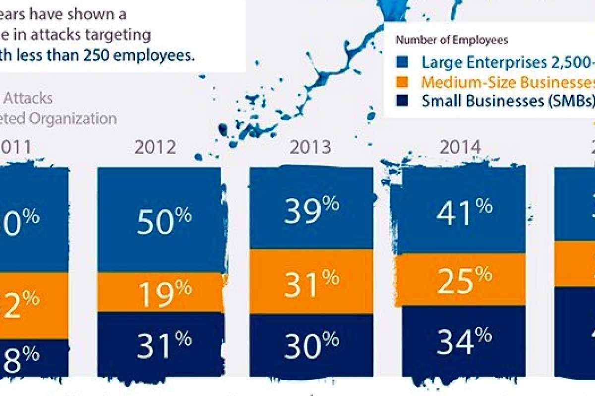 В то же время одна из особенностей текущего момента состоит в том, что организаторы кибератак в качестве мишеней все чаще выбирают не только крупные, но и небольшие предприятия. Так например, согласно опубликованным в 2016 г оценкам Symantec, среди предприятий, подвергшихся целевым (таргетированным) фишинговым атакам, неуклонно растет доля небольших (до 250 сотрудников) предпрприятий. Если в 2011 г. она равнялась 18%, то в
