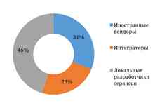 Российский рынок облачных сервисов в 2016 г. составил около 29 млрд руб., говорится в исследовании аналитического центра TAdviser. В структуре российского рынка основную долю с 46% занимают локальные разработчики, которые распространяют свои сервисы как самостоятельно, так и с помощью партнеров — реселлеров и интеграторов. Доля иностранных вендоров облачных решений в России превышает 30%, а на долю интеграторов приходится 23% рынка.