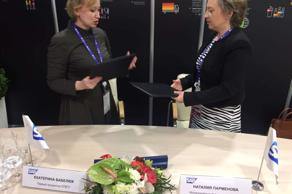 Подписи под документом поставили первый проректор по учебной, внеучебной и учебно-методической работе СПбГУ Екатерина Бабелюк и исполнительный директор SAP СНГ Наталия Парменова. Благодаря заключению соглашения Университет и компания смогут объединить свои интеллектуальные и материальные ресурсы для подготовки высококвалифицированных и конкурентоспособных специалистов.