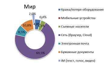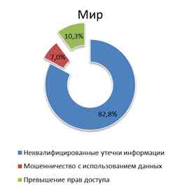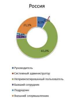 Внутренние нарушители в организации стали причиной примерно восьми случаев потери данных из десяти, почти каждая десятая утечка происходила при участии руководства организации. Для России характерна более высокая, чем в мире доля утечек по вине руководства (8% против 2%), и более низкая доля утечек по вине внешнего злоумышленника (21% против 55%).