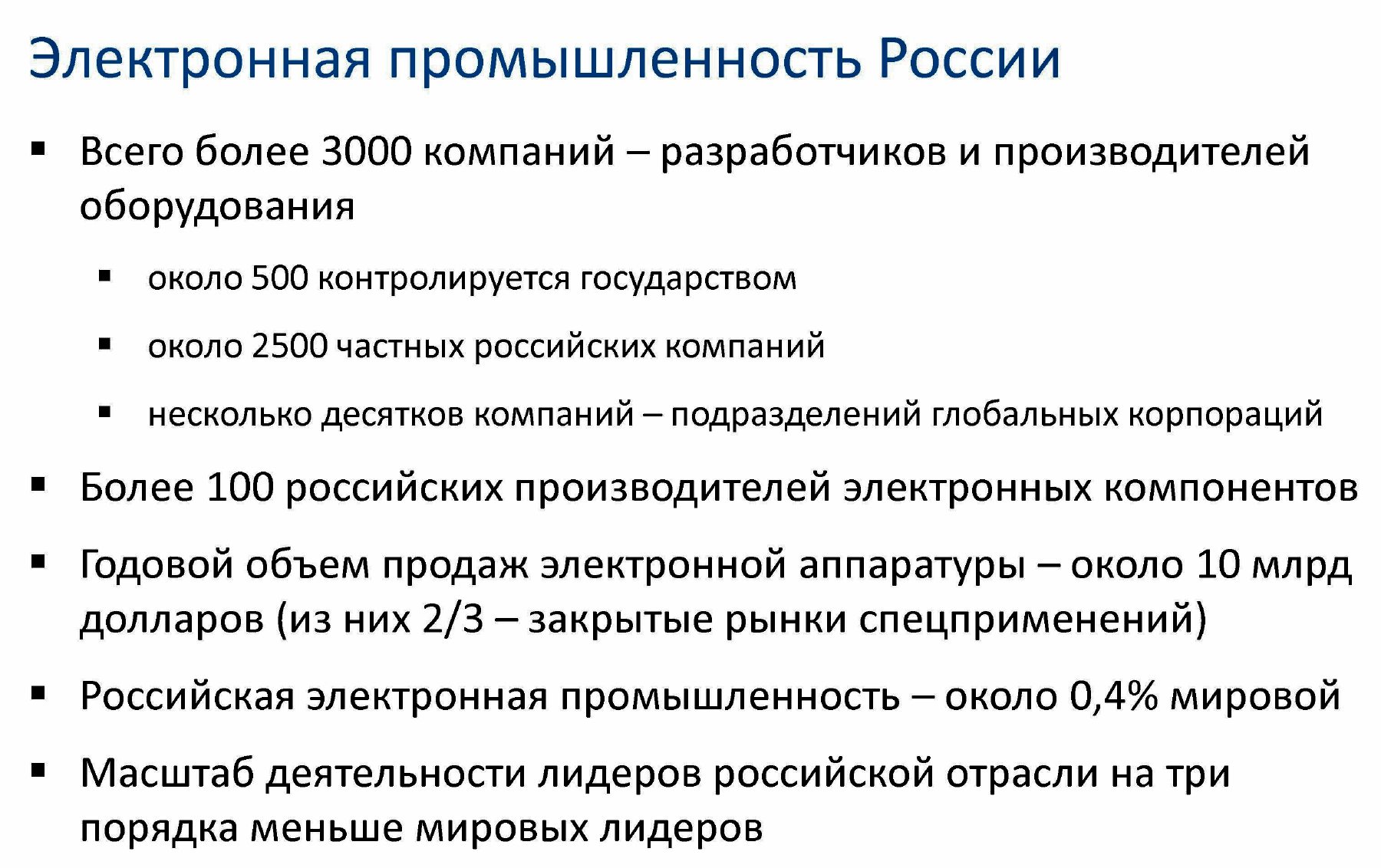 Аналитики АРПЭ полагают, что в нашей стране годовой объем продаж электронной аппаратуры составляет около 10 млрд. долл. (примерно две трети этой суммы приходится на закрытые рынки спецприменений). В то же время российская электронная промышленность составляет лишь около 0,4% от мировой, а масштаб деятельности лидеров российской электронной отрасли на три порядка меньше мировых лидеров.
