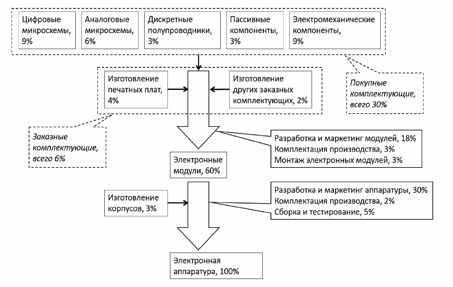 Представляет интерес цепочка создания стоимости в производстве и сбыте электронной аппаратуры (cм. диагр. 3). Обратите внимание: лишь 30% конечной цены среднестатистической электронной аппаратуры приходится на покупные комплектующие. Что сопоставимо с затратами на разработку и маркетинг готовых изделий.