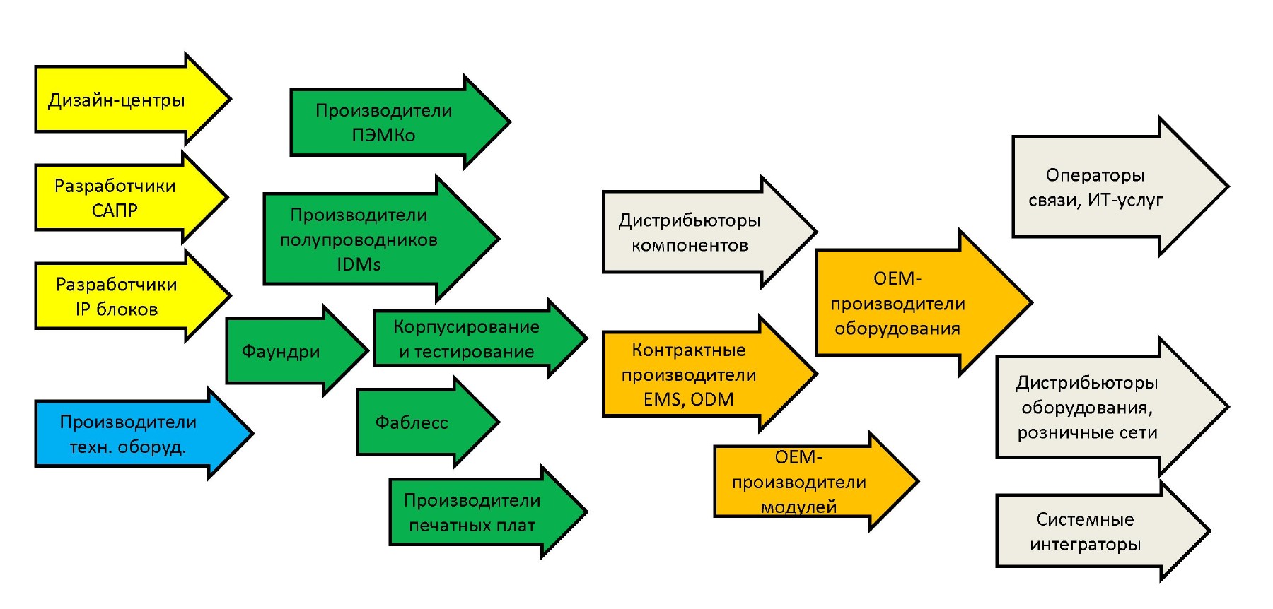 В России создана Ассоциация разработчиков и производителей электроники (АРПЭ). Она учреждена крупнейшими частными игроками электронной отрасли: холдингом GS Group, а также компаниями «Зелакс», «АТОЛ», «Завод „Эталон“» и «Связь инжиниринг». Сообщается, что еще более 30 отечественных предприятий уже заявили о готовности присоединиться к работе АРПЭ. Предполагается, что в будущем АРПЭ объединит свыше ста компаний, так или иначе участвующих (см. диагр. 1) в цепочке производителей электроники. Обратите внимание, что участниками этой цепочки являются также дистрибьюторы компонентов, дистрибьюторы оборудования, розничные сети, системные интеграторы, операторы связи, а также поставщики ИТ-услуг.