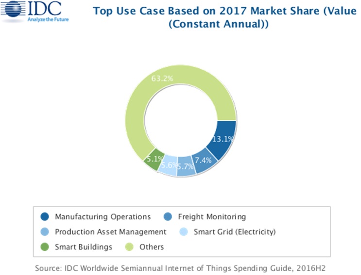 IDC ожидает, что наибольший объем инвестиций в технологии IoT в 2017 году будет в сфере производственных операций (105 млрд. долл.), контроля за транспортировкой грузов (50 млрд. долл.) и управления производственными фондами (45 млрд. долл.). Внедрения интеллектуальных систем энерго-, водо- и газоснабжения (Smart Grid) и управления интеллектуальными зданиями также будут источником значительных инвестиций в этом году (56 млрд. долл. и 40 млрд. долл. соответственно). Эти области применения останутся главным направлением IoT-расходов в 2021 году. В сегменте домашней автоматизации на протяжении пятилетнего прогнозного периода будут наблюдаться высокие темпы роста (CAGR 19,8%). Самый быстрый рост расходов будут демонстрировать сегменты автоматизации аэропортового хозяйства (CAGR 33,4%), зарядки электромобилей (21,1%) и контекстного маркетинга в магазинах (20,2%).