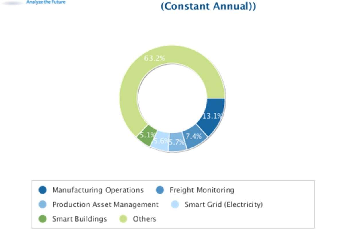 Самые крупные инвестиции в IoT в 2017 году ожидаются в сегментах производства (183 млрд. долл.), транспортных перевозок (85 млрд. долл.) и коммунального хозяйства (66 млрд. долл.). Межотраслевые инвестиции в IoT (области применения, охватывающие разные отрасли: самоуправляемые автомобили, интеллектуально управляемые системы обслуживания зданий и т. д.) составят 86 млрд. долл. в 2017 году и будут оставаться в числе главных направлений на протяжении прогнозного периода. Потребительский сегмент будет четвертым по объему расходов на IoT в 2017 году (62 млрд. долл.), но станет третьим крупнейшим в 2021 году. Самый быстрый рост расходов будет наблюдаться в страховании (CAGR 20,2%), потребительском (19,4%) и межотраслевом сегменте (17,6%).