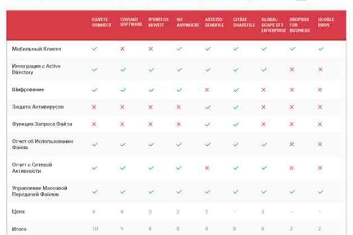 Аналитический департамент Artezio оценил удобство загрузки всех доступных на рынке решений, проверил работоспособность, сопоставил платформы по цене (недорогие решения получили больше баллов). Были проанализированы такие технические возможности, как наличие мобильного клиента, интеграция с Active Directory, шифрование, защита антивирусом, функция запроса файла, отчет об использовании файла, отчет о сетевой активности, управление передачей большого количества файлов.