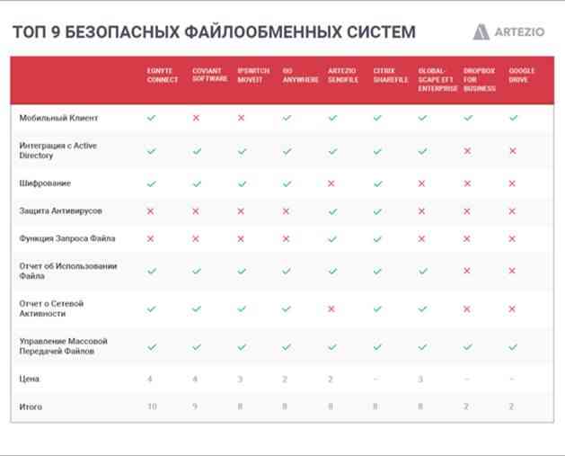 Наиболее сбалансированный продукт, по версии экспертов Artezio, — Egnyte Connect, наименее пригодны для корпоративного использования Google Drive и Dropbox for business. В середине рейтинга оказалась собственная разработка Artezio, входящая в реестр российского ПО, — сервис SendFile для безопасной передачи файлов большого размера.